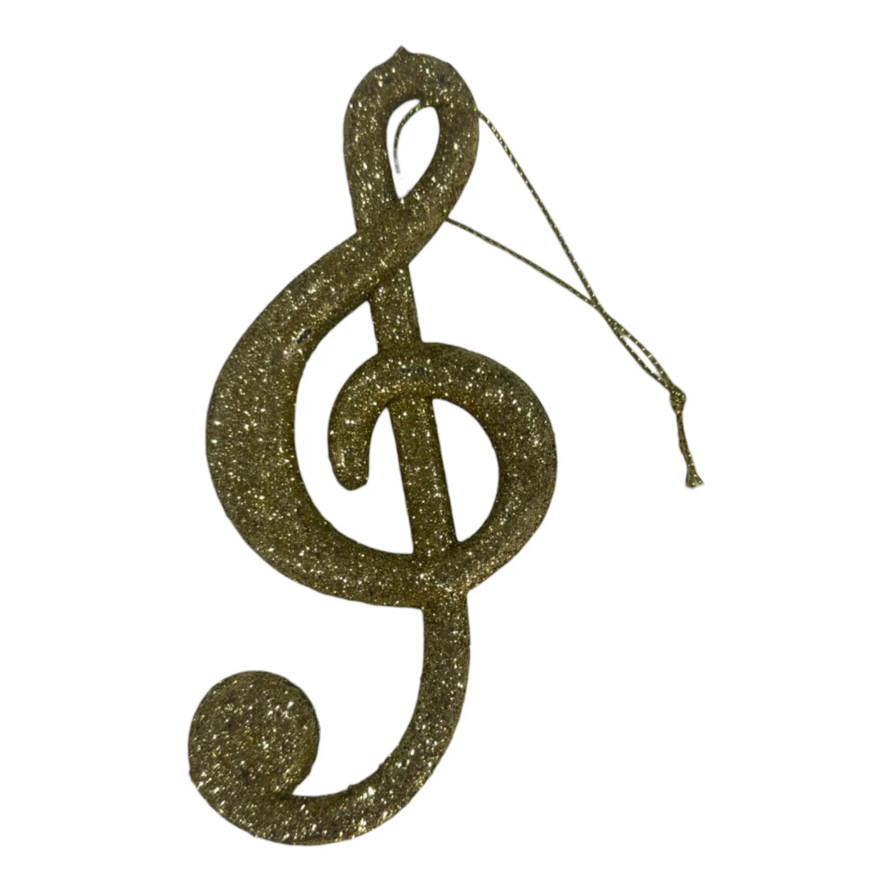 Adorno colgante en forma de clave de sol. Con acabado dorado brillante y cubierto de escarcha, es perfecto para los amantes de la música o para agregar un acento creativo y sofisticado.