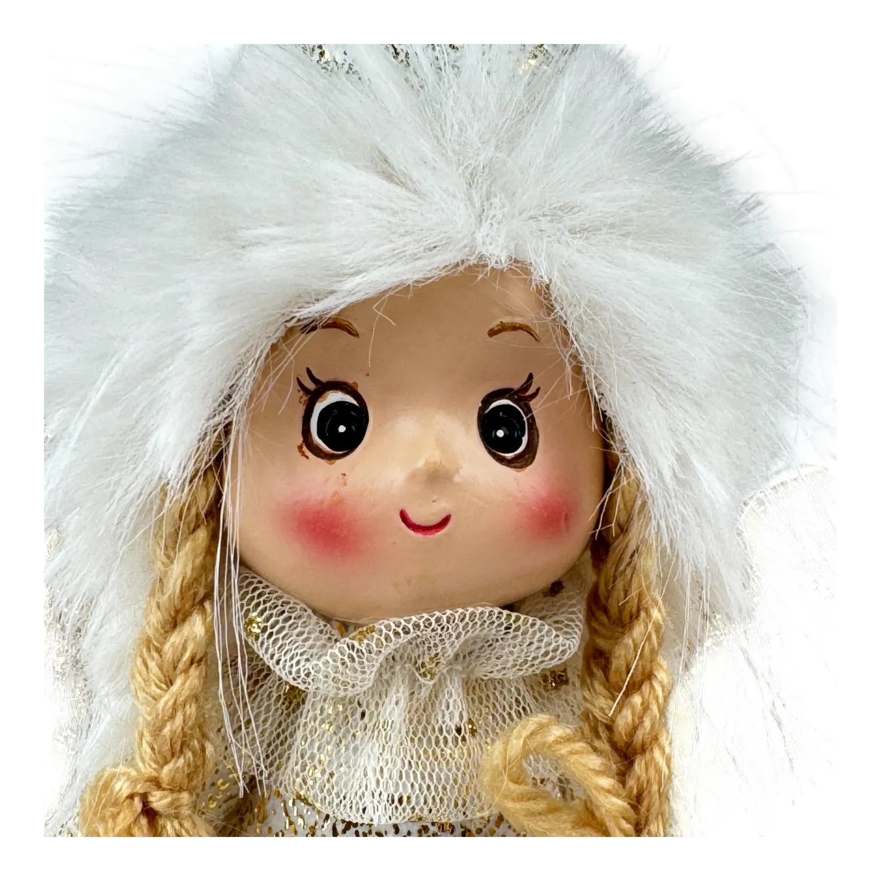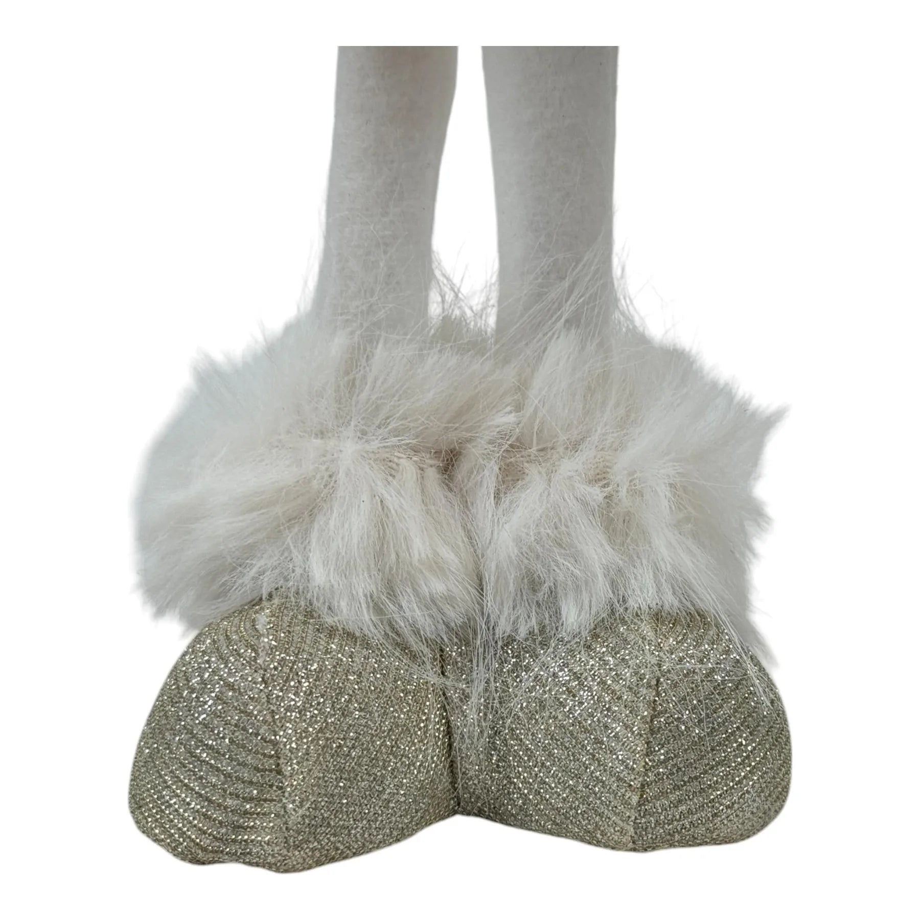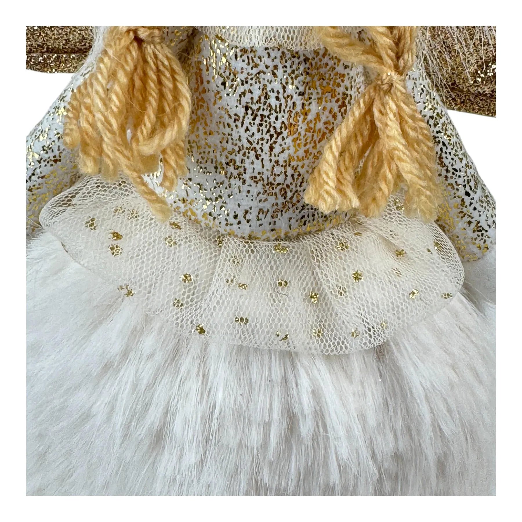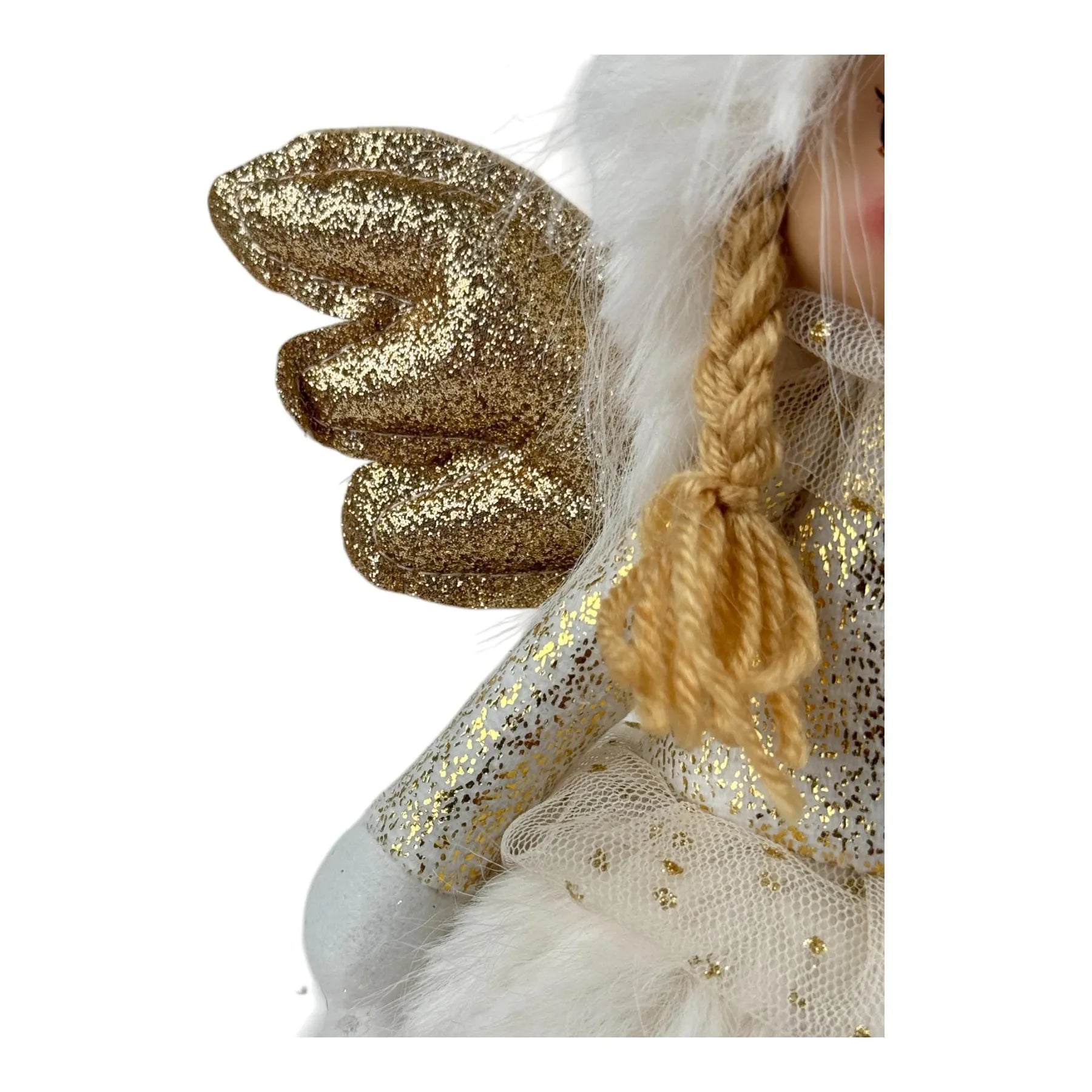 • Diseño: Alas doradas con glitter, sombrero y falda en tela suave de efecto peluche, botas con brillo dorado y peluche. Base con peso para mayor estabilidad