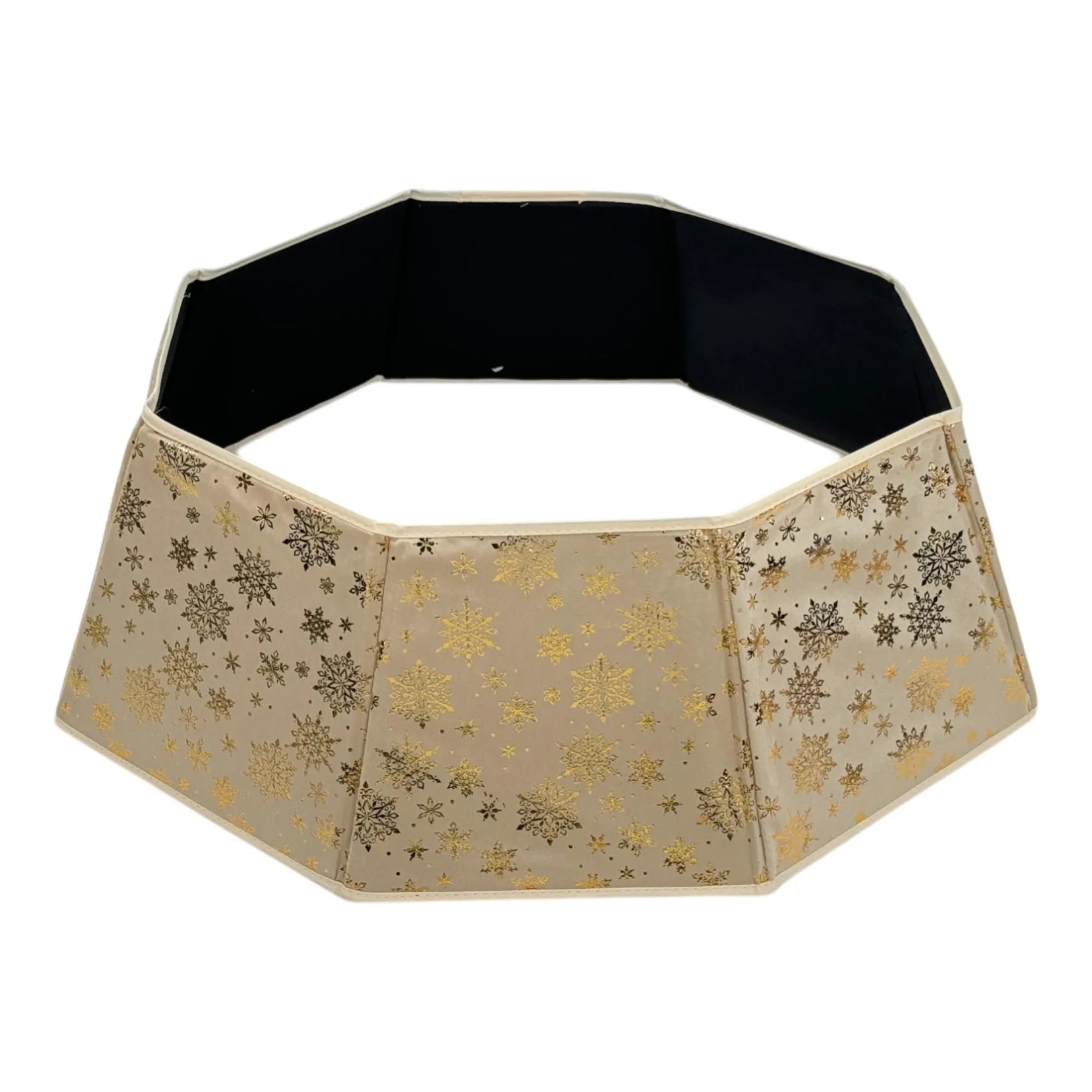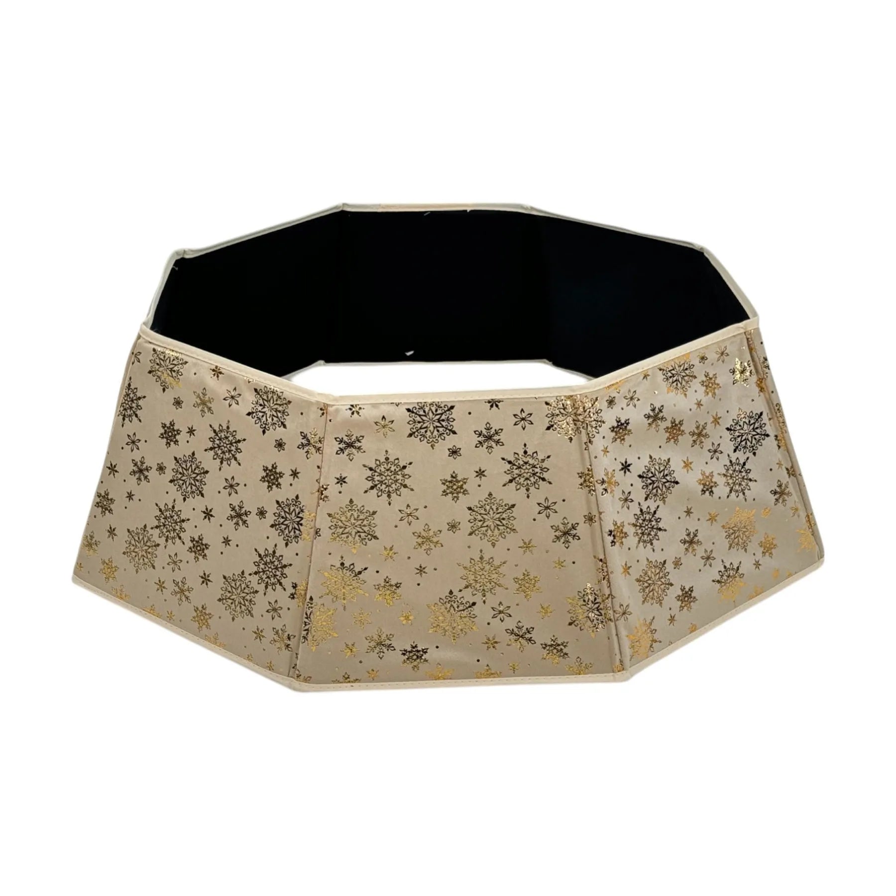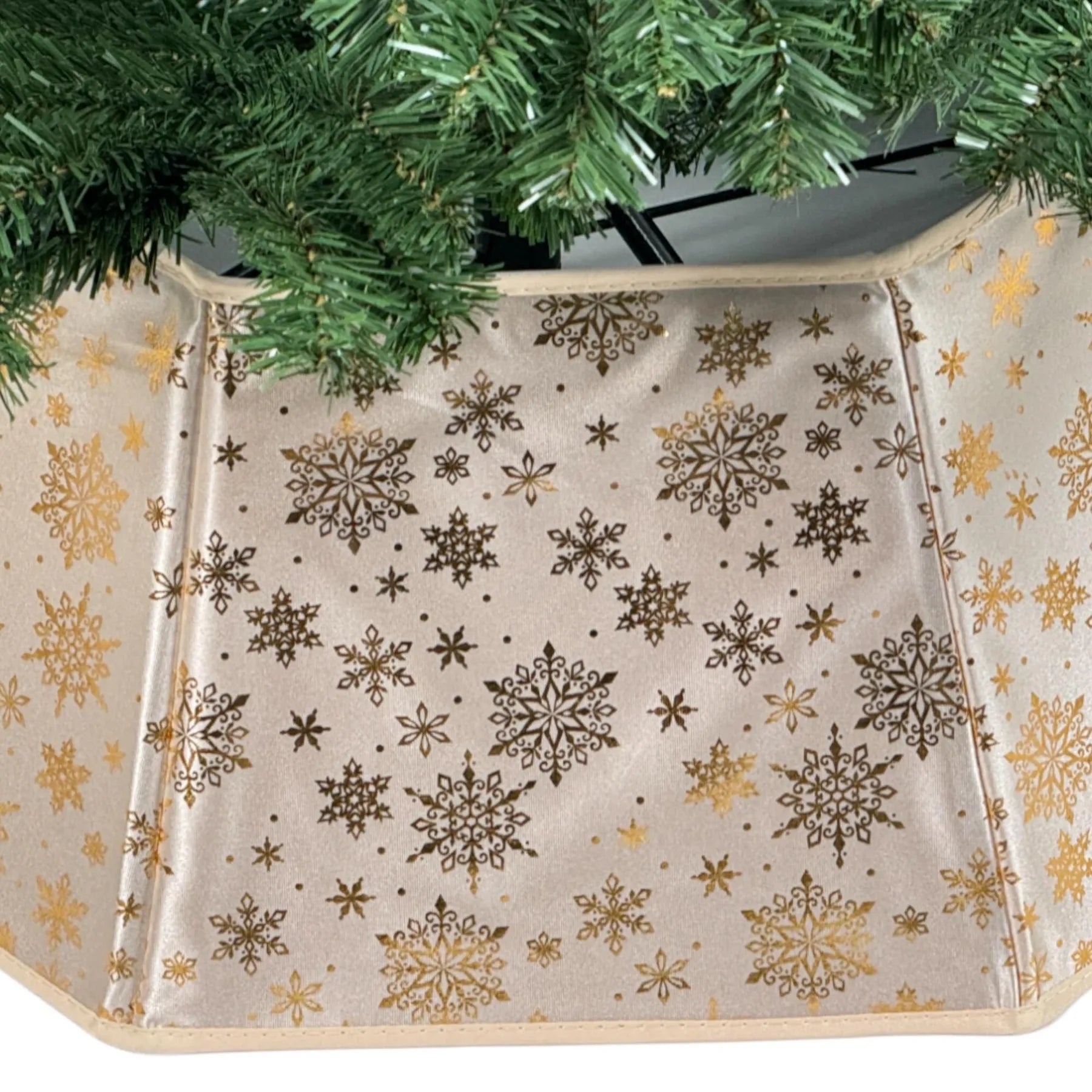 Embellece tu árbol navideño con esta elegante base decorativa en tono dorado, adornada con copos de nieve brillantes que añaden un toque de sofisticación y calidez a tu decoración.