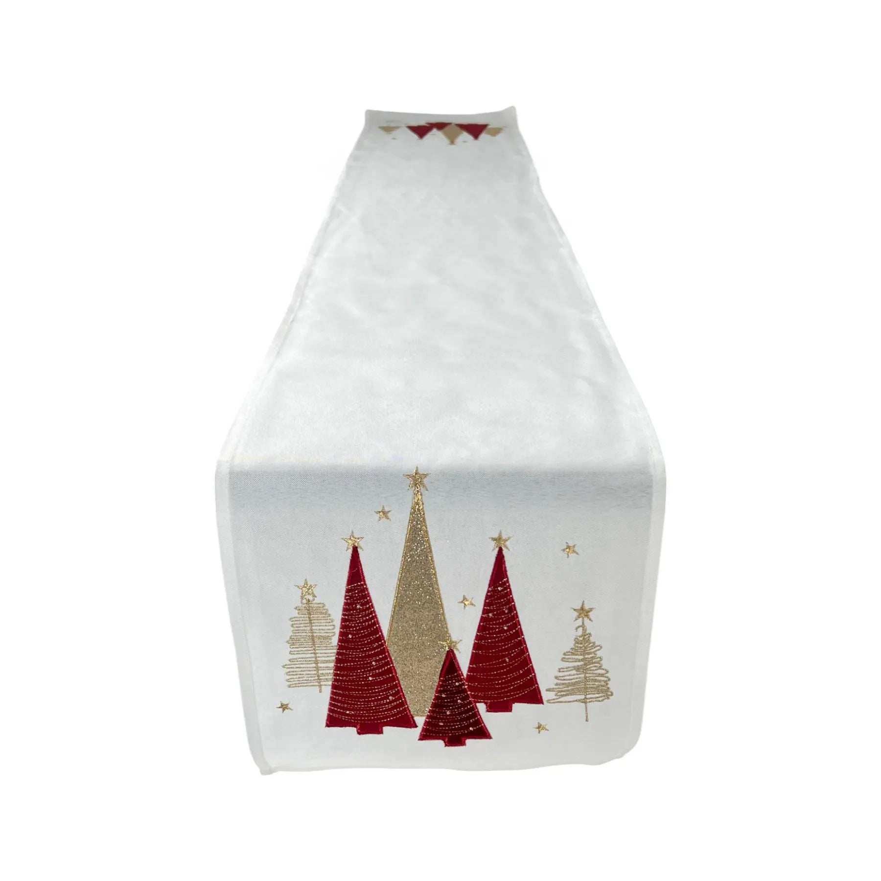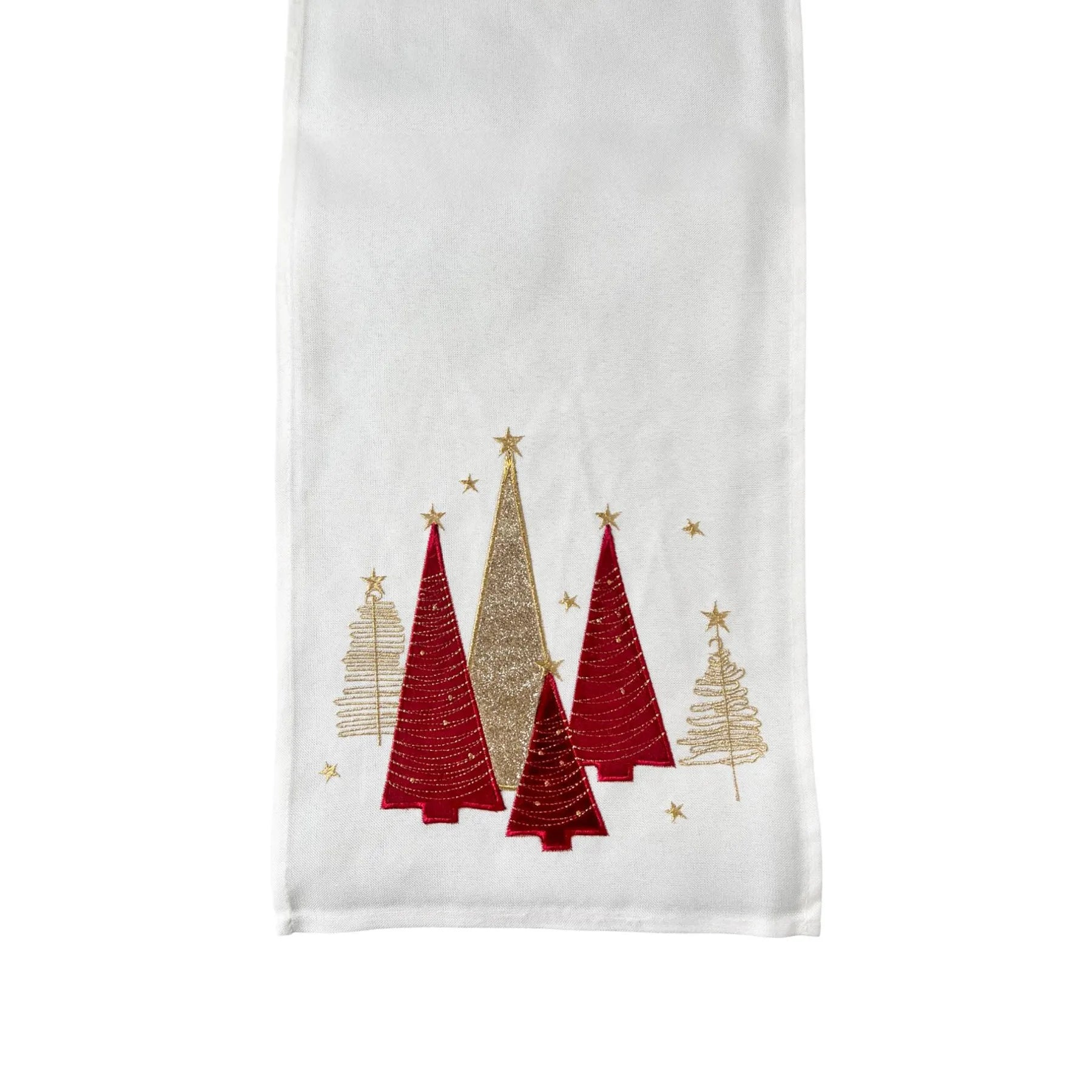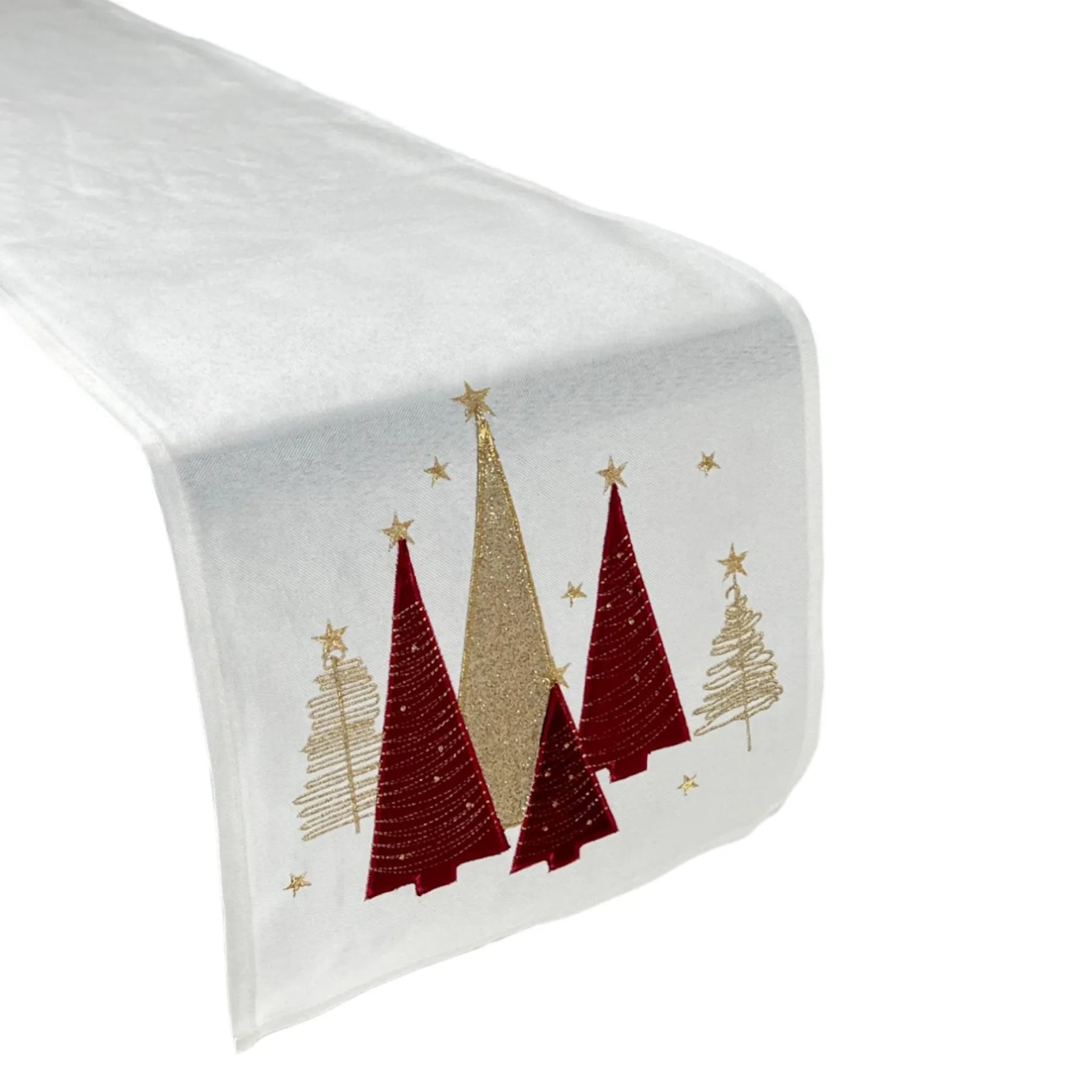 • Diseño: Bordado con árboles navideños en dorado y rojo, sobre fondo blanco que resalta los detalles festivos. Ideal para mesas de comedor, consolas o muebles auxiliares.