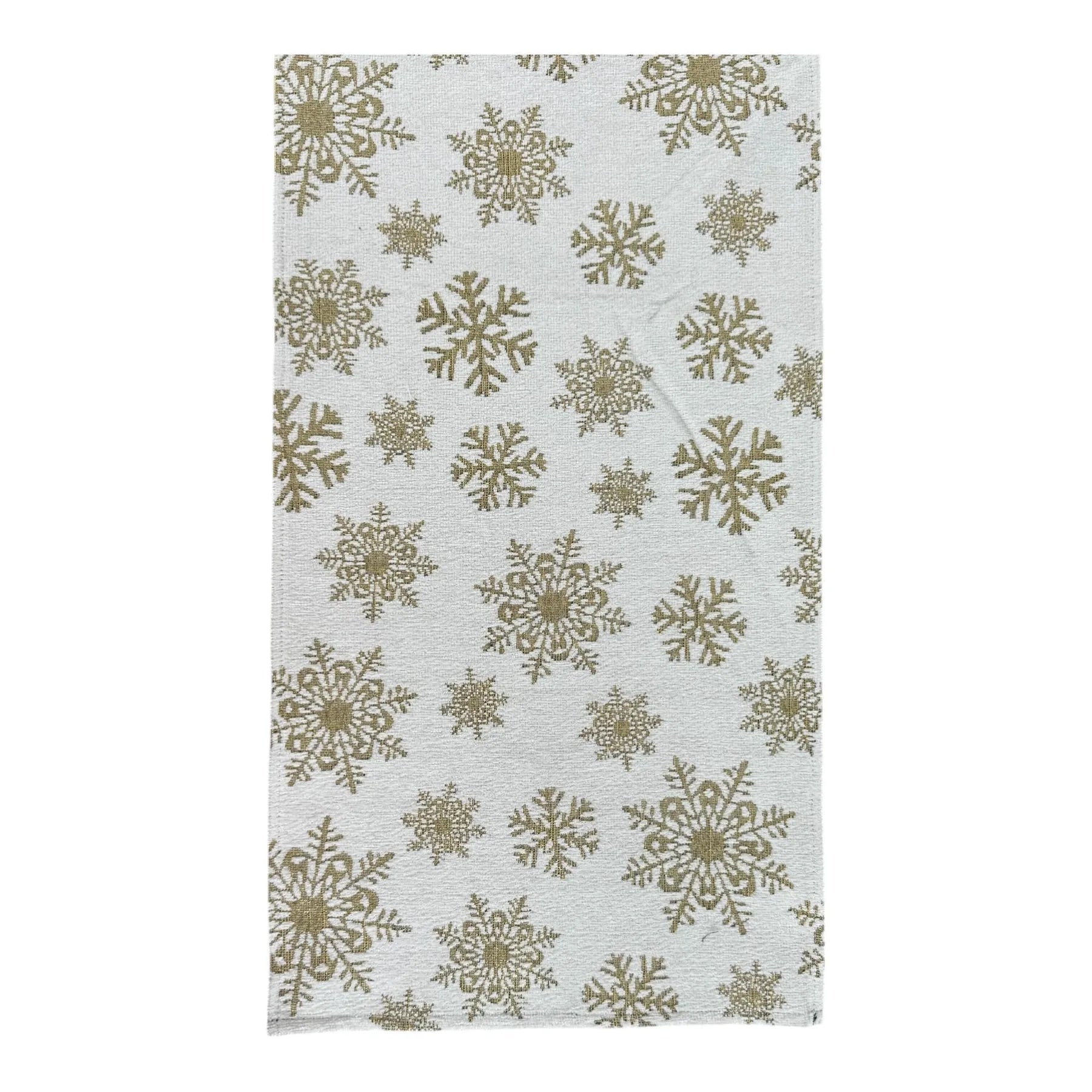 Camino de mesa elegante con diseño de copos de nieve en tono dorado sobre fondo claro, ideal para decorar tu mesa durante la temporada navideña o invernal.