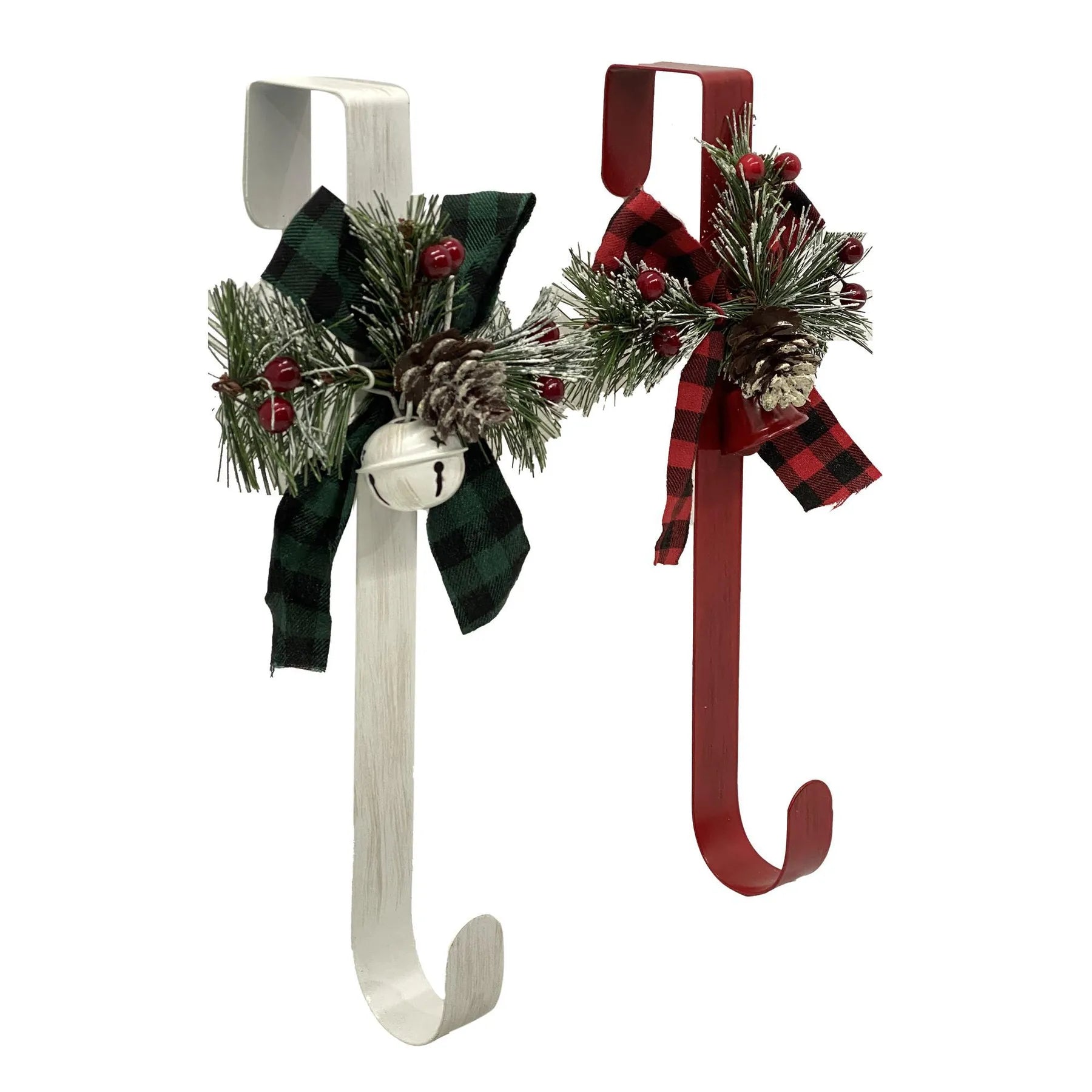 Dale un toque festivo a tus puertas con estos colgadores navideños decorados con moños de tela escocesa, ramas de pino, piñas y cascabeles. Perfectos para sostener coronas navideñas de forma elegante y segura.