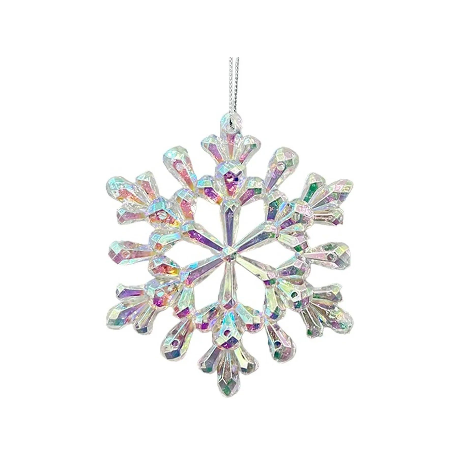 Este elegante adorno de copo de nieve acrílico facetado brilla como una gema gracias a su acabado iridiscente y multi-facético. Fabricado en plástico acrílico transparente, refleja la luz creando un efecto mágico y luminoso. Perfecto para complementar decoraciones navideñas sofisticadas y contemporáneas, destaca por su delicadeza visual y ligereza al colgar. Es ideal como adorno individual o parte de ambientaciones modernas y etéreas.