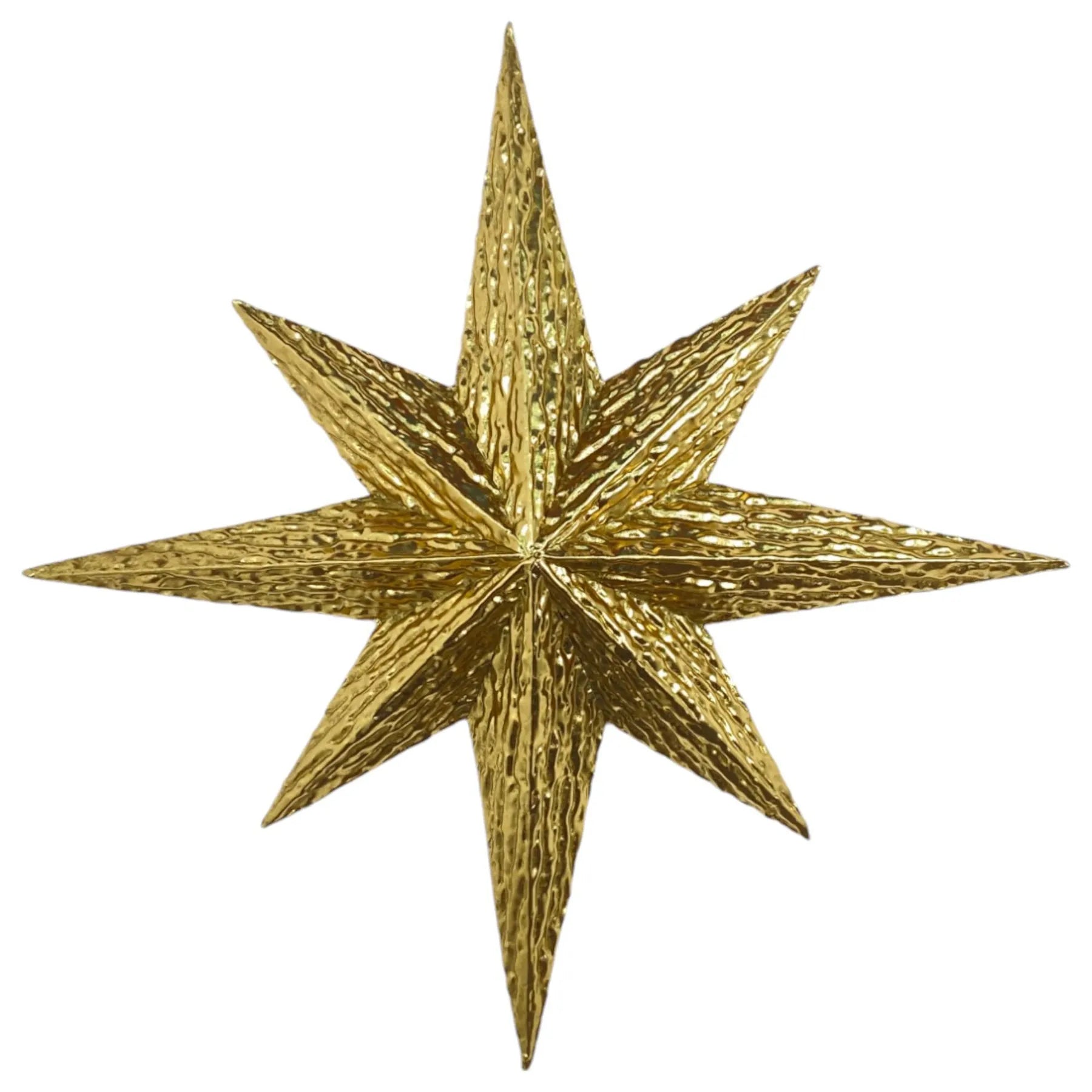 Deslumbra tus espacios con esta estrella decorativa de gran tamaño en acabado dorado martillado. Ideal para centros decorativos, muros o como estrella de árbol en instalaciones grandes