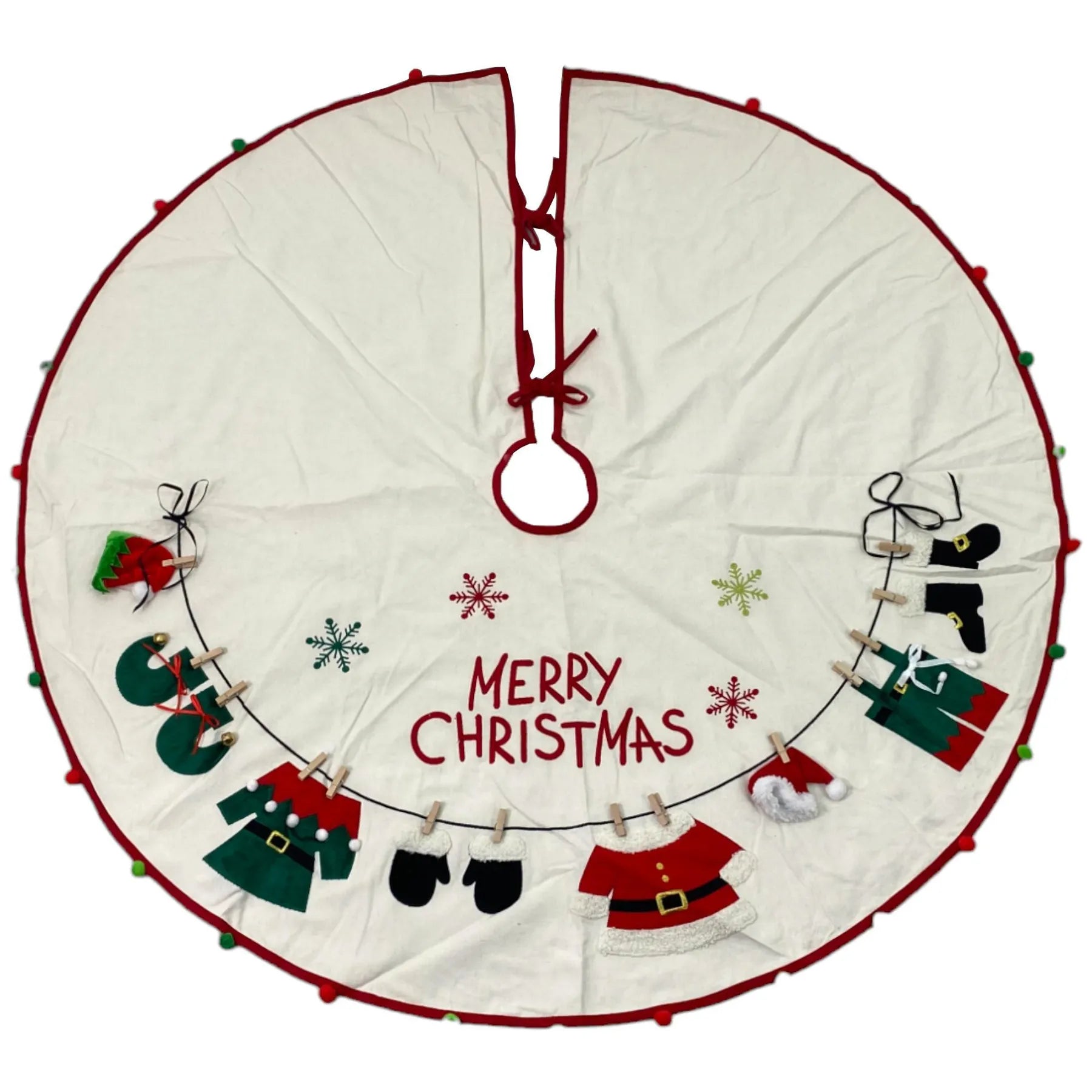 Falda decorativa para árbol con temática navideña y detalles colgantes de ropa de Santa Claus, ideal para cubrir la base del árbol y darle un toque festivo al espacio.