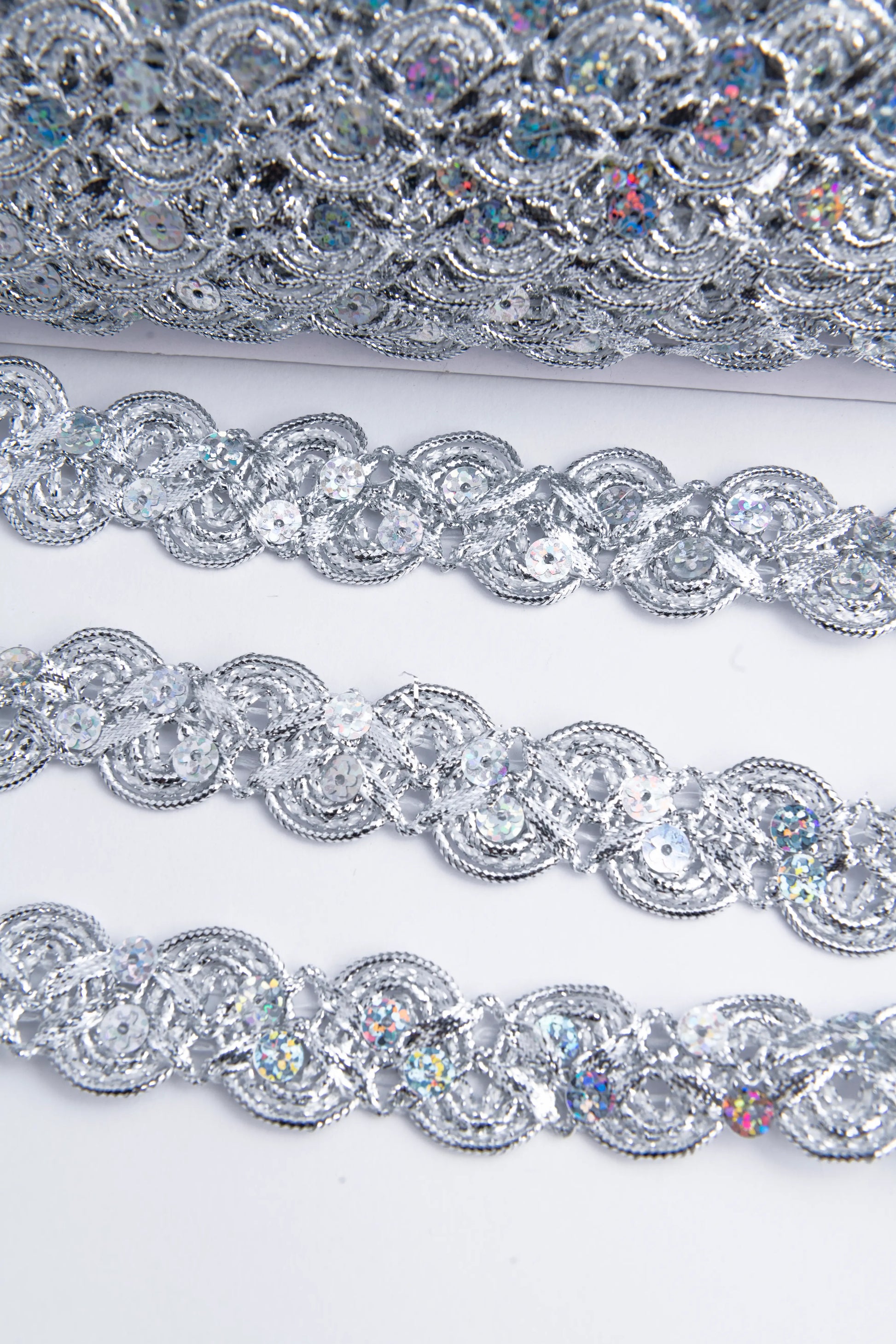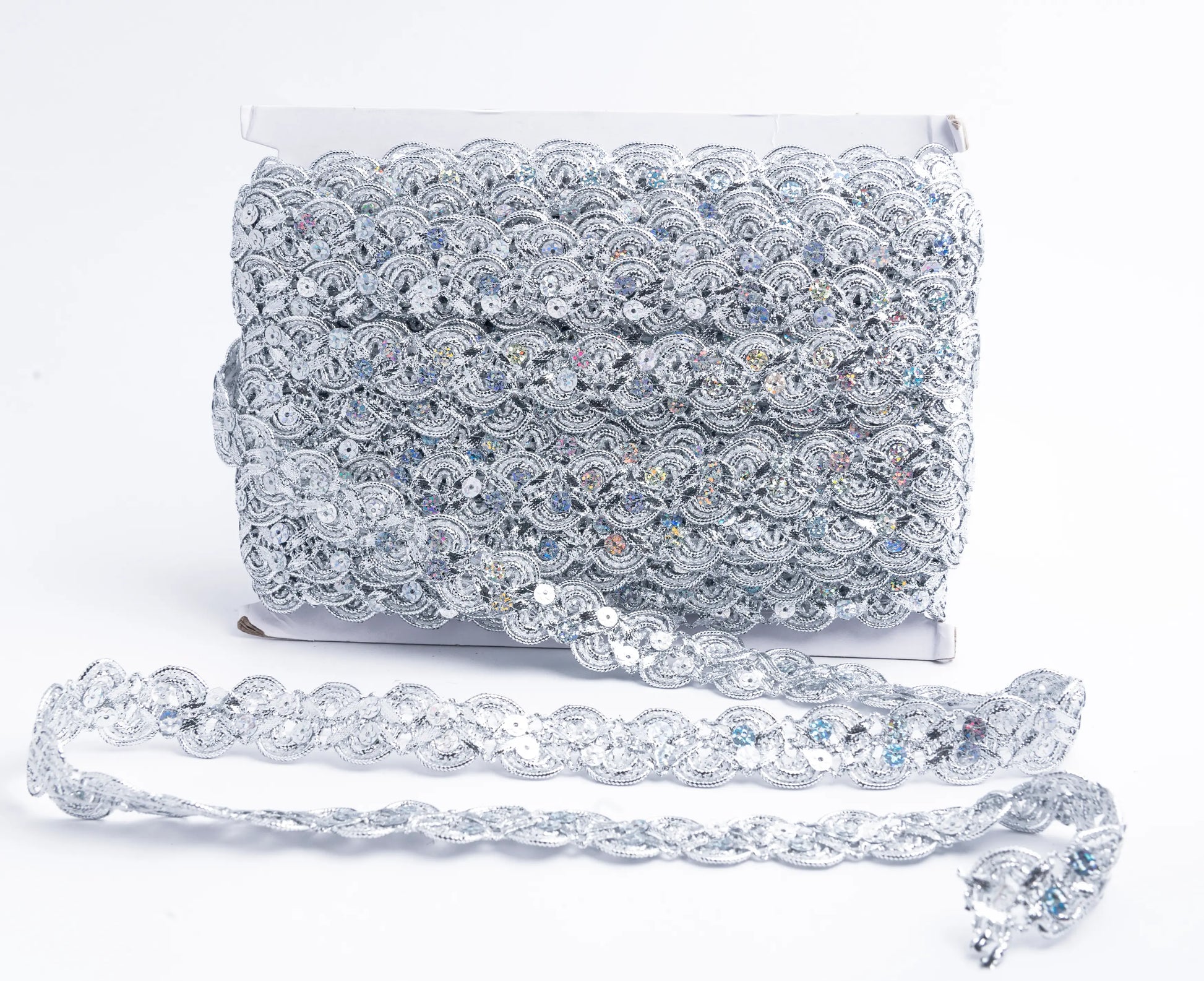 Este galón decorativo en tono plateado holográfico de 1.5 cm de ancho y 27 m de largo es perfecto para embellecer tus creaciones. Con un elegante diseño floral integrado y lentejuelas brillantes, ofrece un efecto visual moderno y sofisticado, ideal para moda, manualidades y decoración de eventos de alto impacto.