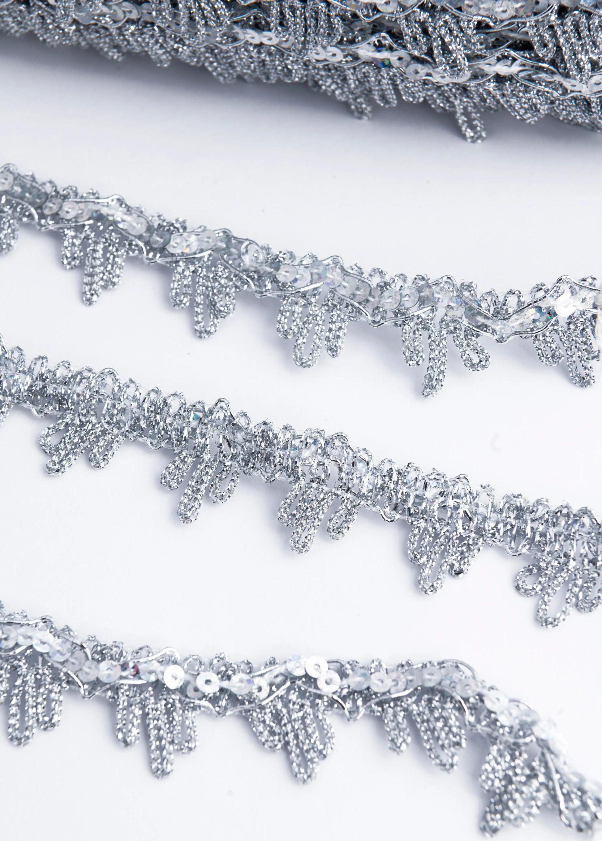 Este elegante galón metalizado en tono plateado con lentejuelas brillantes es ideal para quienes buscan dar un toque festivo, elegante o artesanal a cualquier creación. Su diseño de ondas con flequillo metálico y reflejos lo hace destacar en prendas, decoraciones y manualidades.
