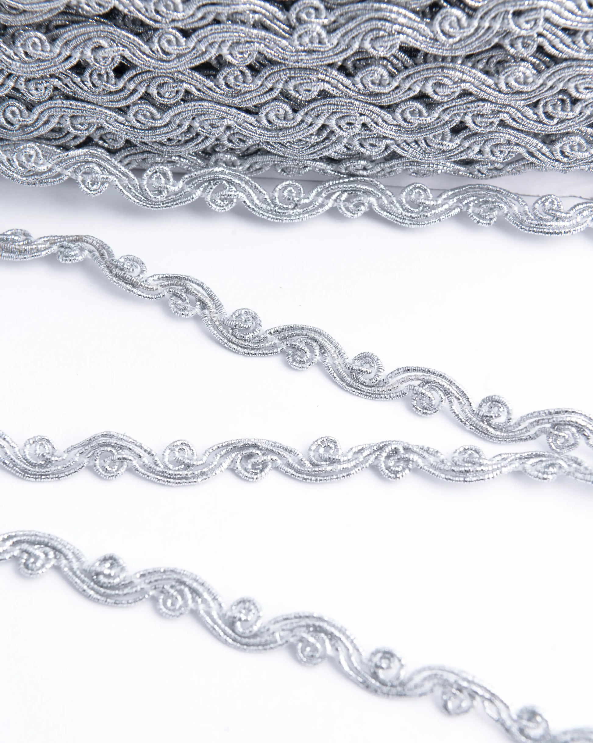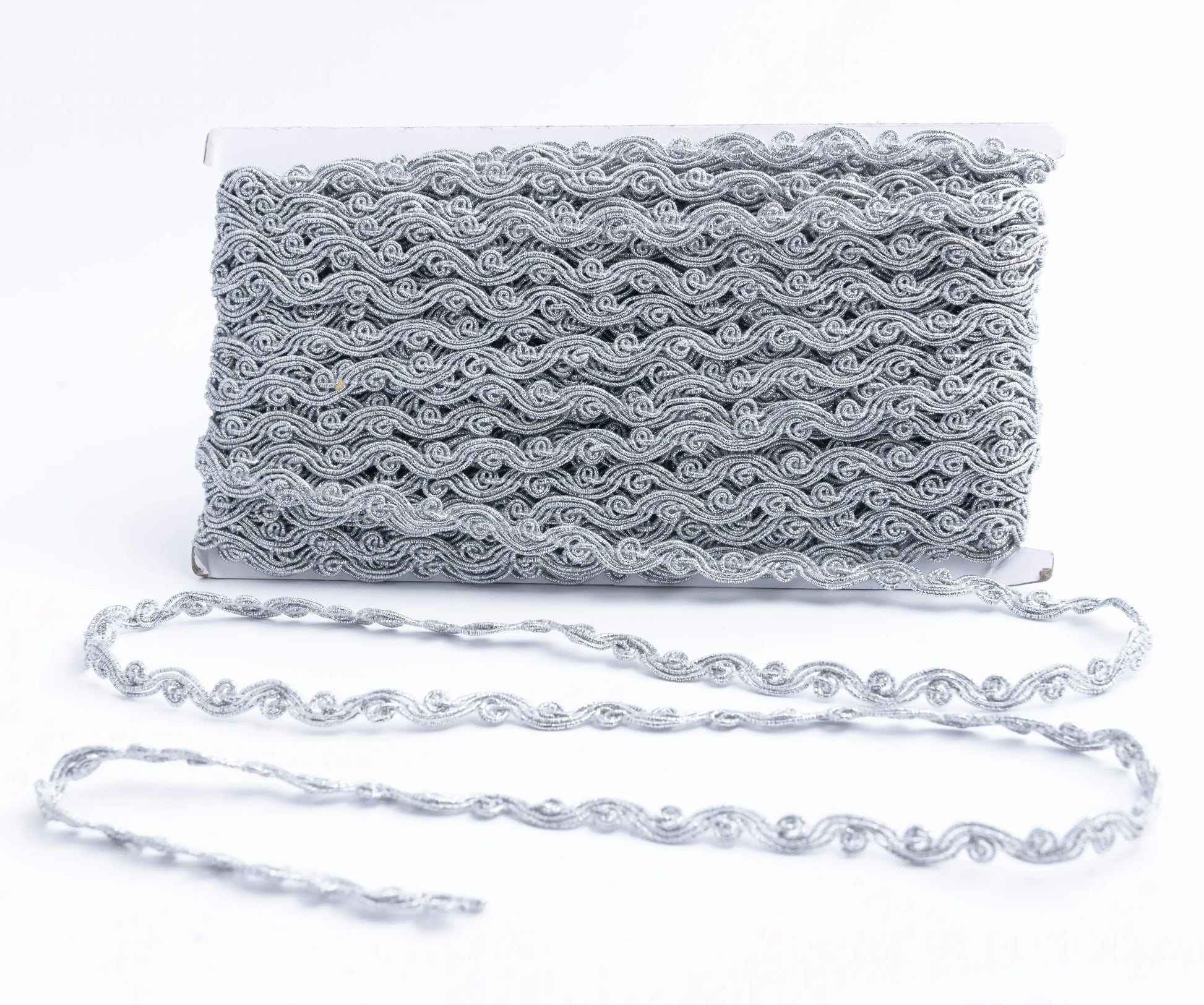 Este galón decorativo de 8 mm de ancho está elaborado en poliéster metalizado con un diseño entrelazado de ondas y nudos. Su acabado brillante lo hace ideal para acentos elegantes en costura, decoración temática, manualidades o moda escénica. Se entrega en rollo completo de 27 m, listo para usar.