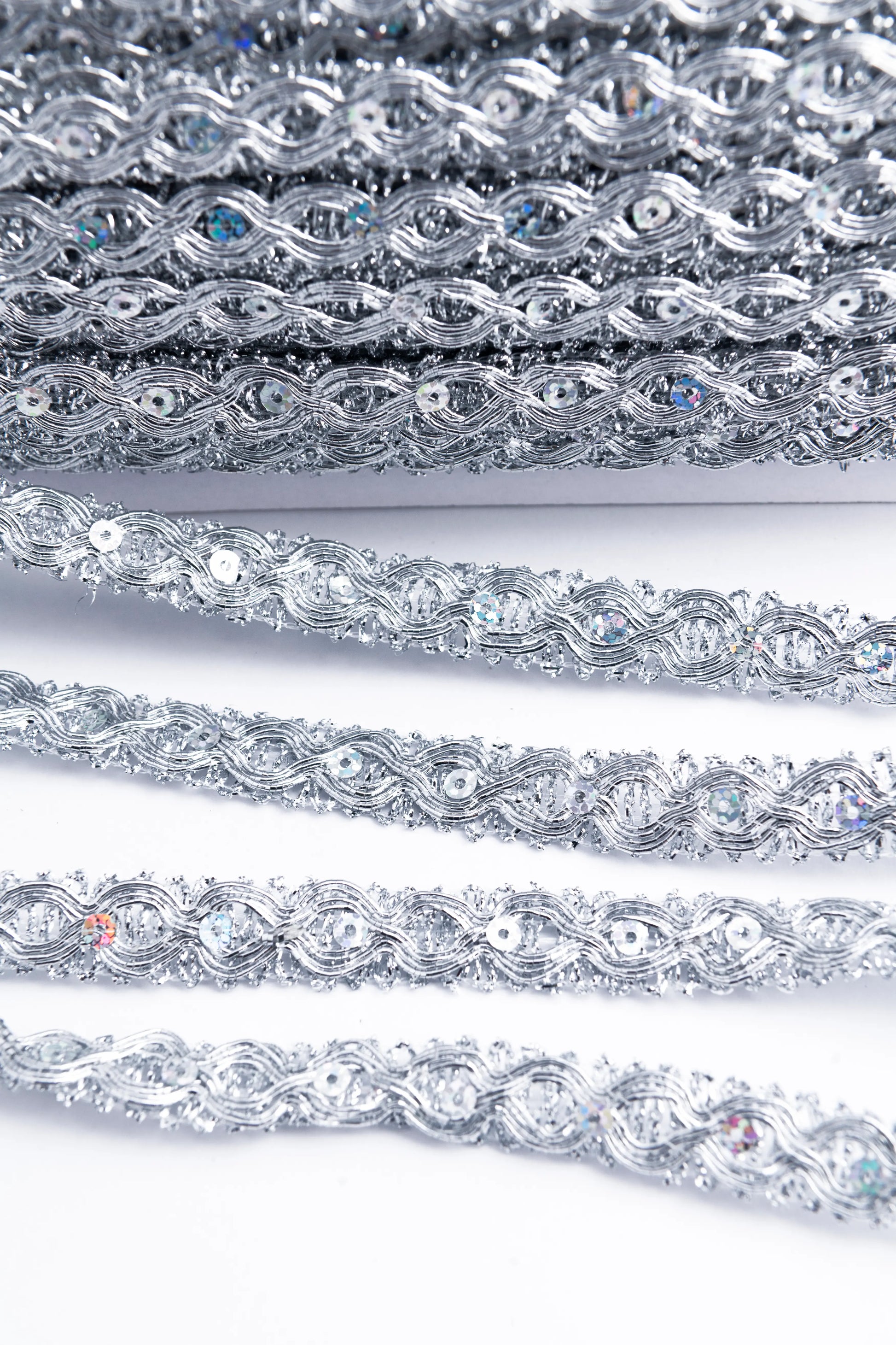 Este galón decorativo metalizado de 12 mm de ancho está confeccionado en poliéster con lentejuelas plateadas integradas, formando un patrón ondulado delicado que refleja la luz con elegancia. Su diseño versátil lo convierte en la elección ideal para aplicaciones en moda, decoración temática, eventos especiales y proyectos DIY. Se entrega en rollo continuo de 27 m, listo para ser usado en costura, pegado o montaje.