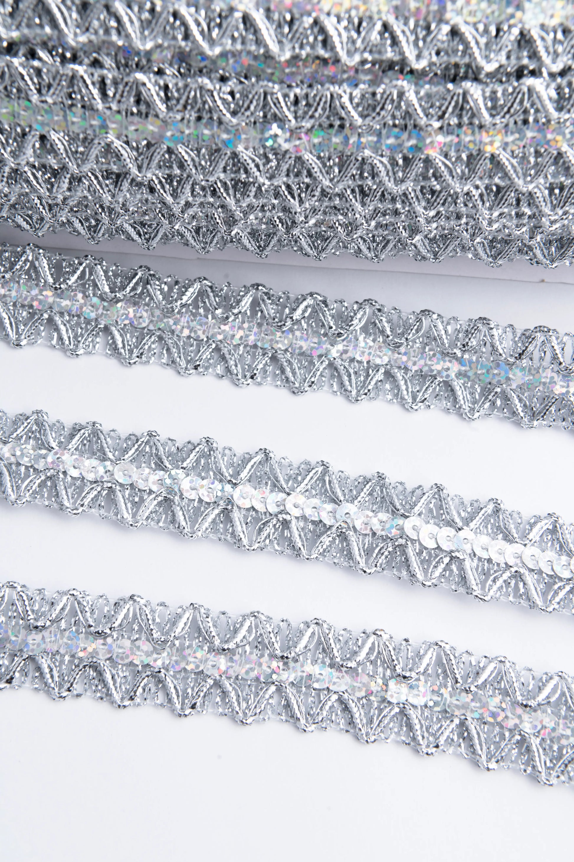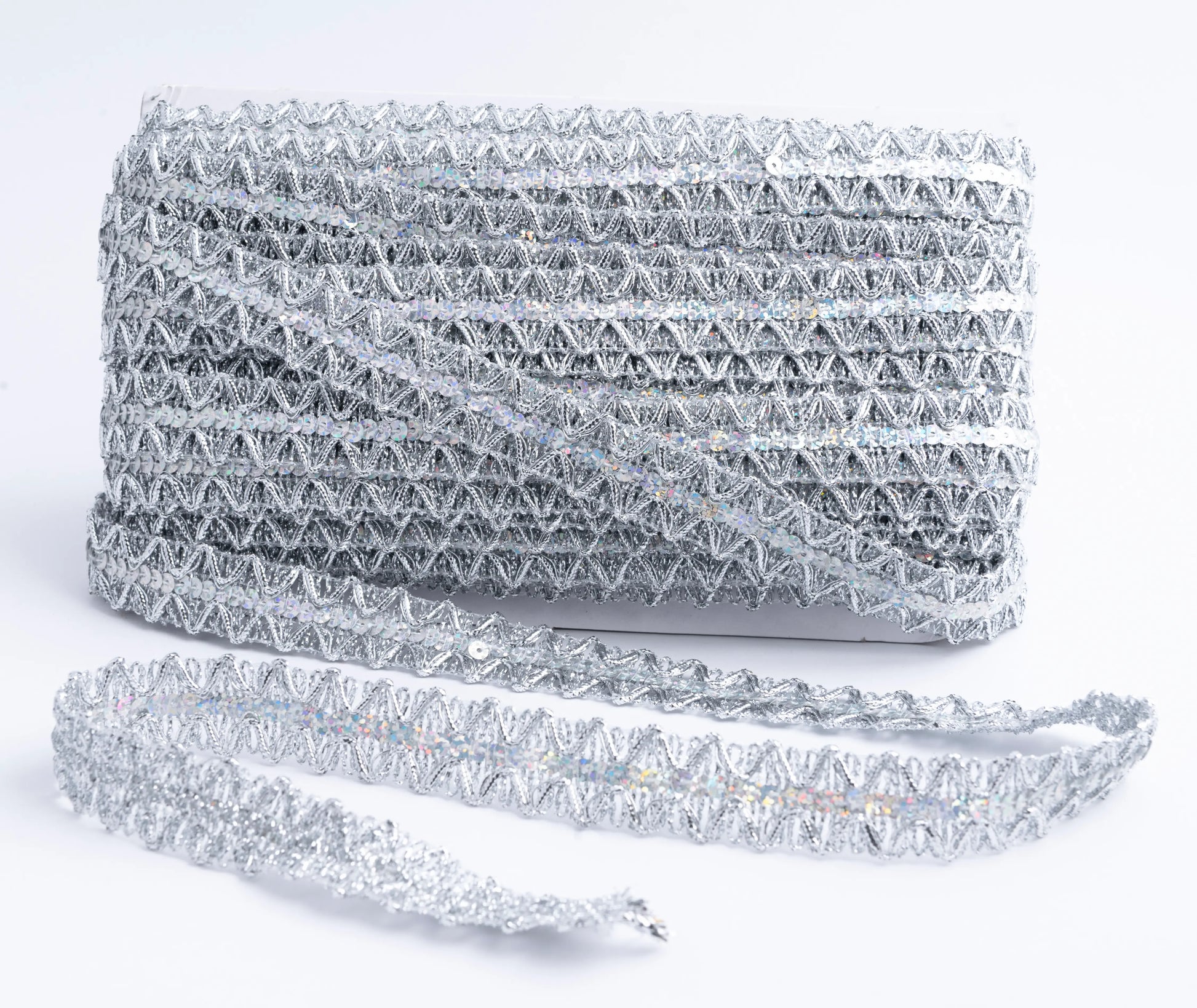 Complementa tus proyectos con este elegante galón plateado de 2 cm de ancho con lentejuelas holográficas. Su brillo luminoso y diseño delicado elevan prendas, accesorios y decoraciones, ofreciendo lujo y versatilidad en un solo material.