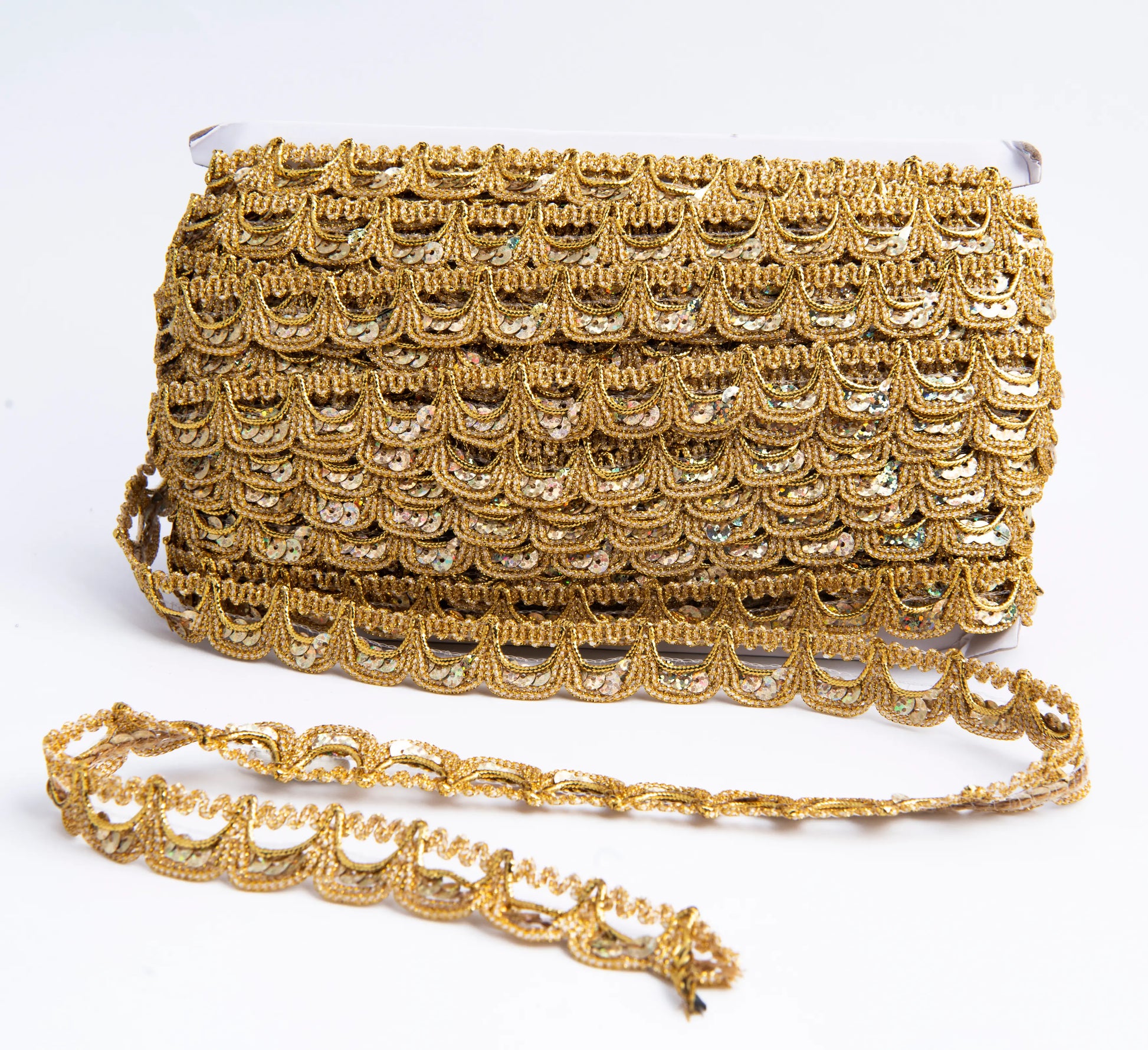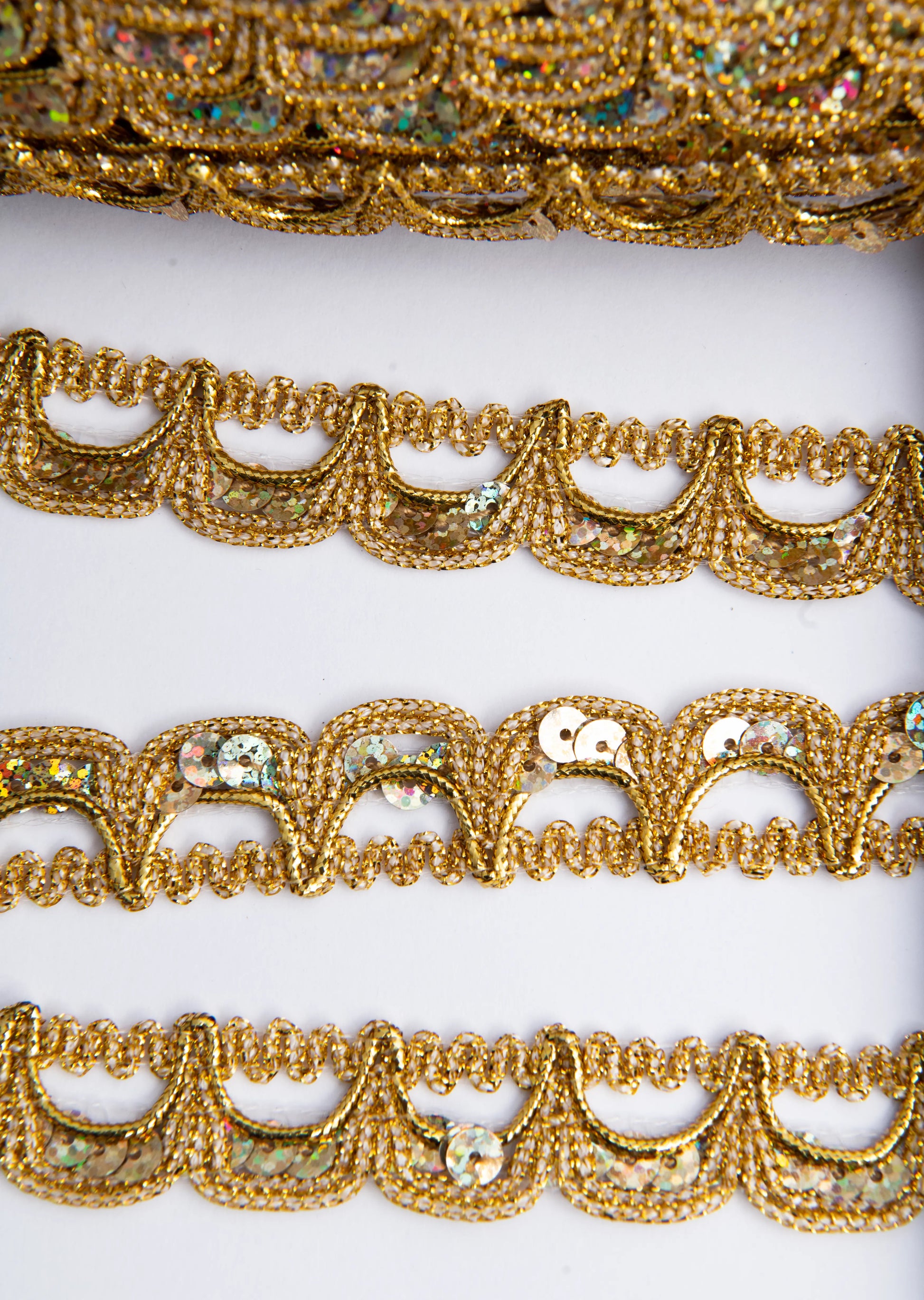 Este galón en color dorado holográfico es un detalle decorativo que aporta luz, textura y sofisticación a cualquier proyecto. Su diseño festoneado en forma de ondas, acompañado de lentejuelas brillantes, es perfecto para elevar prendas, artesanías, disfraces y decoraciones.