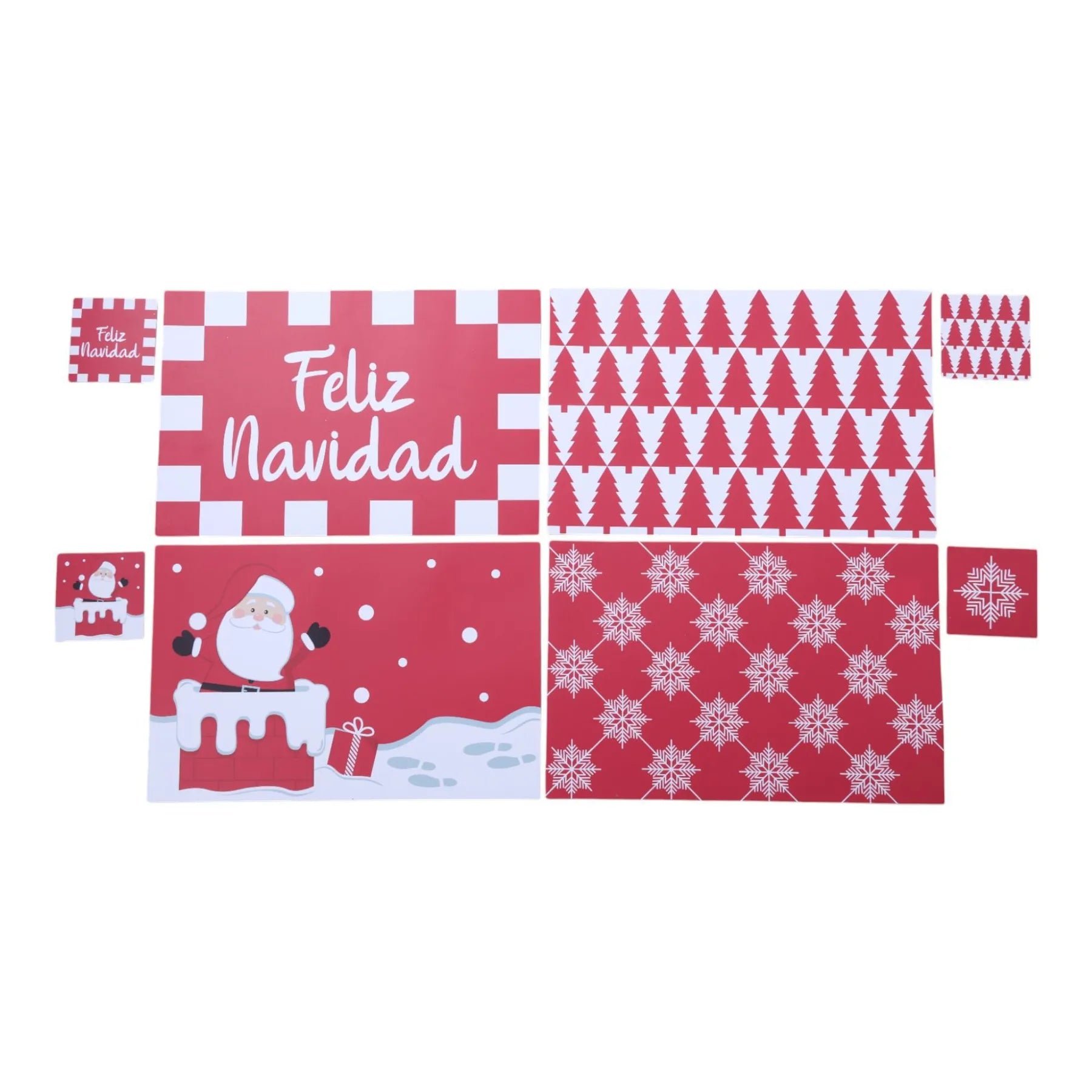 Set navideño decorativo para mesa, ideal para cenas festivas. Incluye individuales y portavasos con diseños variados en tonos rojos y blancos, destacando motivos como árboles, copos de nieve, y Santa Claus.