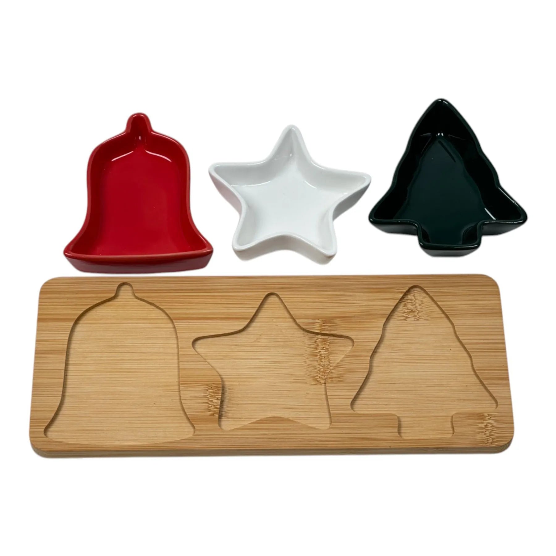 Set decorativo ideal para servir snacks, dips o postres en reuniones navideñas. Incluye 3 platos con forma de figuras festivas y una elegante bandeja de bambú.