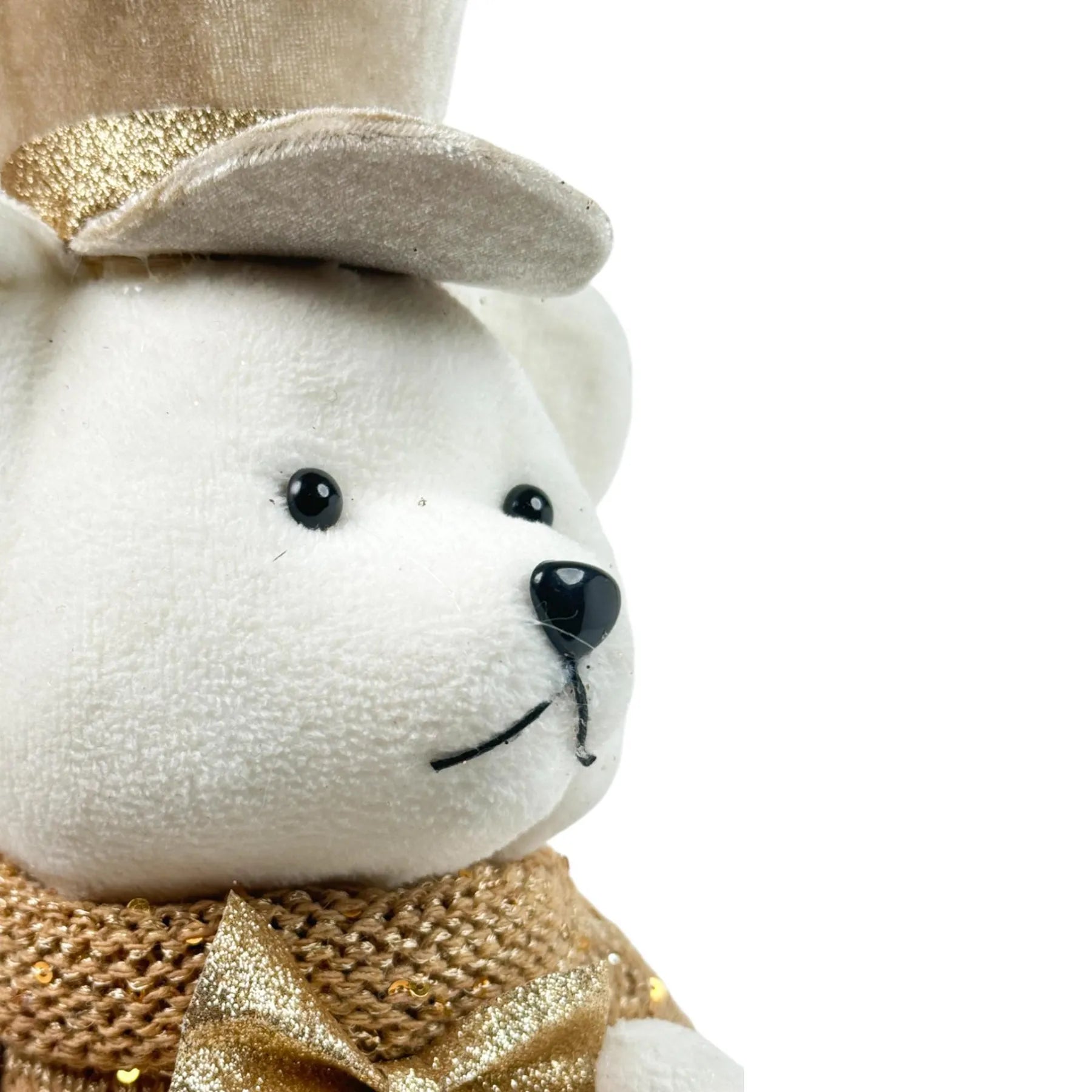 Encantadora figura de oso polar decorativo en posición sentada, con sombrero de copa dorado, suéter brillante y moño. Una pieza cálida y elegante para realzar tu decoración navideña.