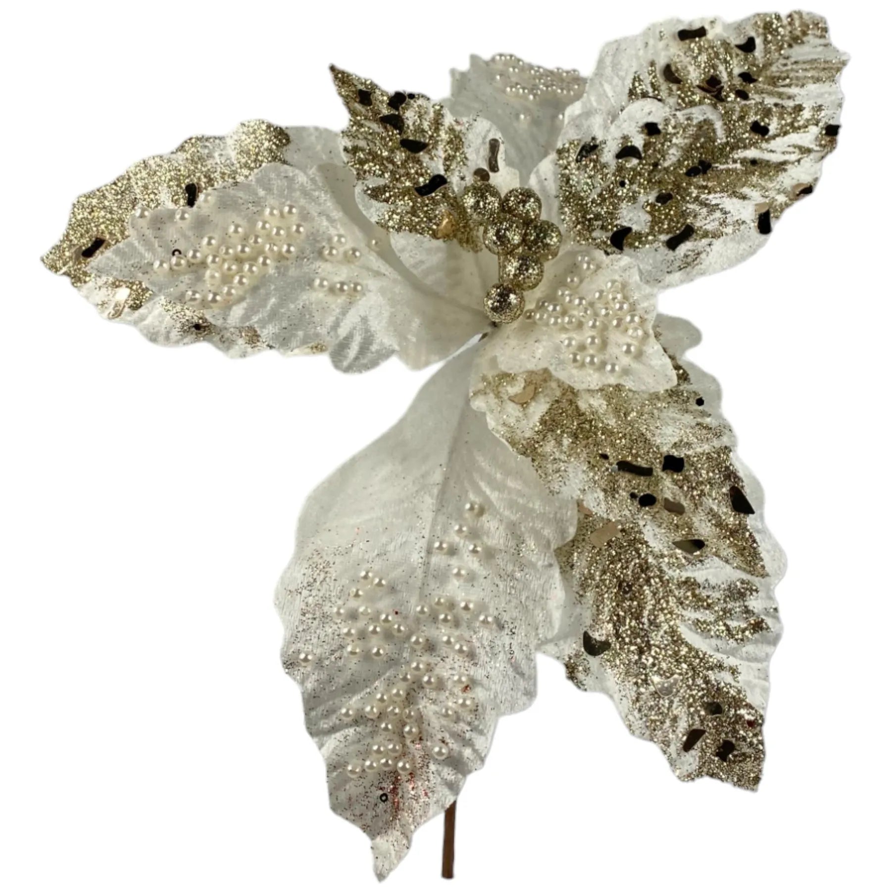Noche Buena Decorativa Blanca con Perlas y Glitter Dorado – 38 cm