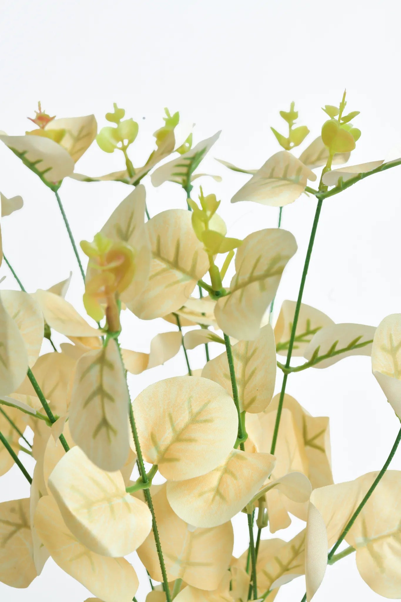 Incluye el clásico follaje de dólar eucalipto en tonos amarillo, cuidadosamente diseñado para entregar elegancia y naturalidad en un ramo sintético de 45 cm de longitud.