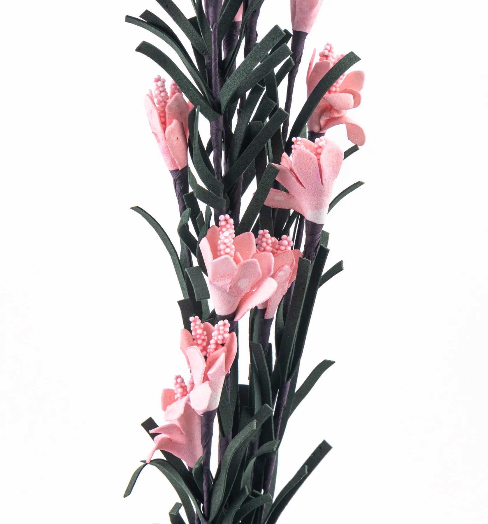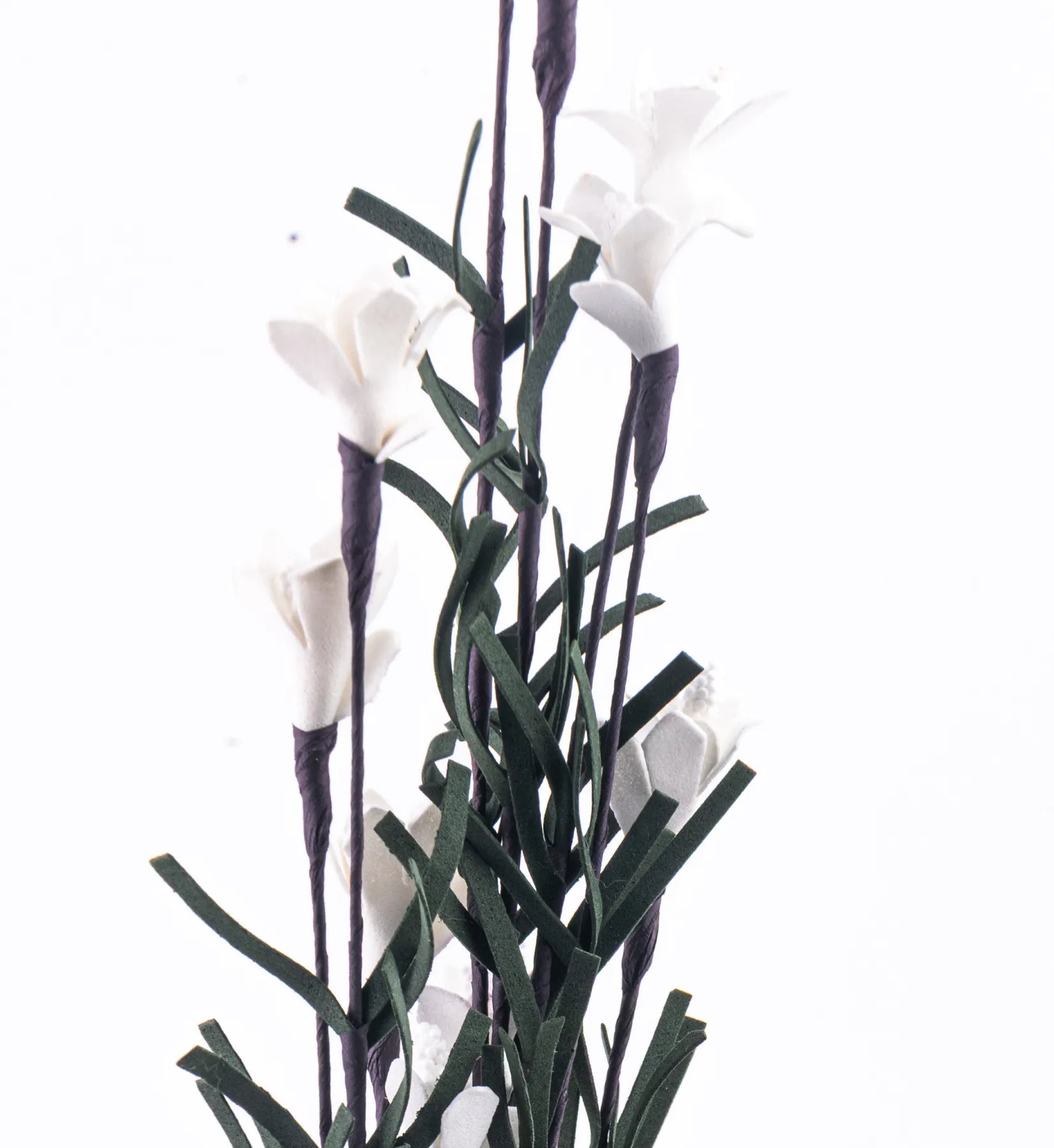 Con materiales sintéticos que imitan la textura suave de las flores y el aspecto rugoso del tallo, esta pieza combina verde oscuro en hojas, amarillo suave en flores y marrón oscuro en el tallo para un efecto natural y armonioso.